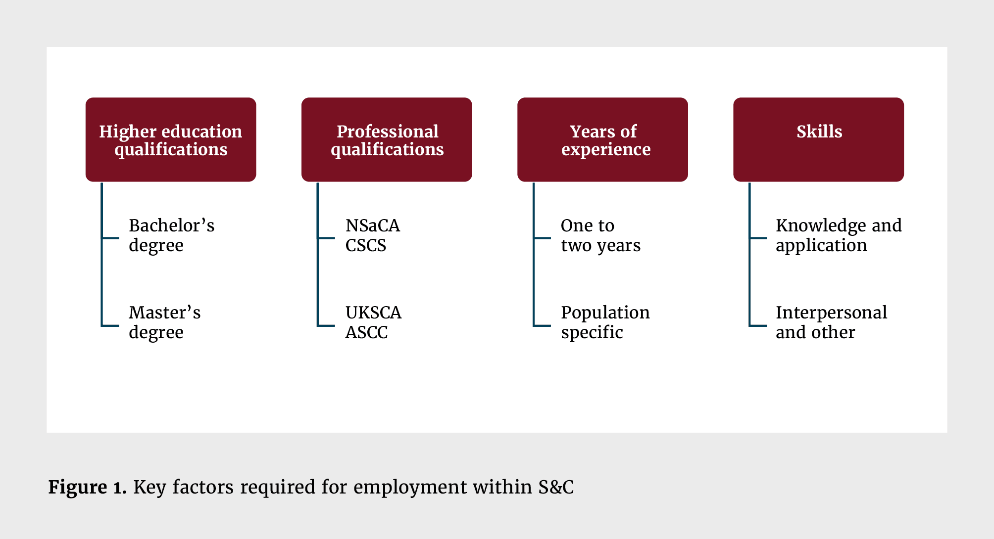 Key factors required for employment within S&C include higher education qualifications, professional qualifications, years of experience and the development of skills (Figure 1). The majority (73%) of S&C job descriptions list a bachelor’s degree within a sports science-related field as essential, with a master’s degree outlined as desirable on 27% of occasions.17 Certification from the National Strength and Conditioning Association (NSCA) is the most commonly (45%) sought professional accreditation, followed by the UK Strength and Conditioning Association (UKSCA) on 29% of occasions. However, the cited study used NSCA, UKSCA, LinkedIn, Indeed.com and Glassdoor.com jobs boards because no vacancies were available on the Australian Strength and Conditioning Association (ASCA). If vacancies were available via the ASCA jobs board, then increased regionality may occur around the professional accreditation being sought. Sporting organisations also required one to two years of experience, but 63% of the job descriptions did not define what areas this was required within (eg, senior or youth athletes).16
