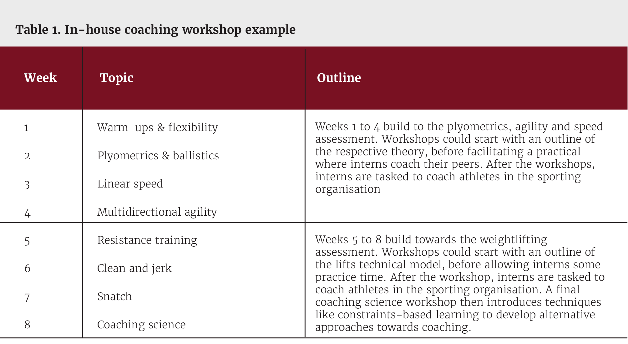 The application skills most demanded for S&C employment, which are appropriate for development within internships, were delivery, testing and data analysis/reporting.18 Delivery skills are formally developed throughout the coaching workshops, where interns must coach exercises across different training modalities. Observing and reflecting on sessions within the sporting organisation would then enable interns to build upon this knowledge informally. Testing skills are formally learned through the needs analysis and testing workshop, where interns must propose a testing battery suitable for their case study athlete. Interns could then be directed towards readings that they can review informally to deepen their formally acquired knowledge. Data analysis skills would be formally covered within the athlete monitoring workshop by tasking interns to process data collected by the sporting organisation. These skills could then be built upon informally through mentoring where senior peers support interns to continue working with data across their internship.