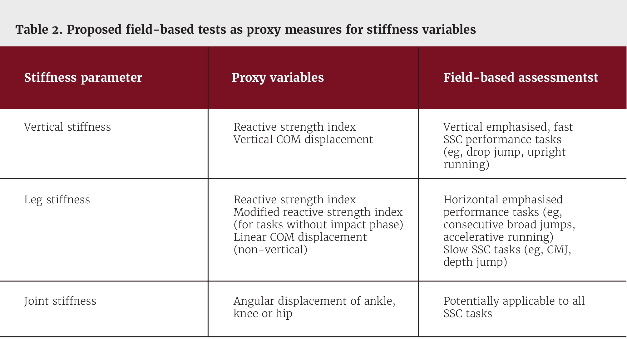In the proposed examples, vertical stiffness changes could be monitored via the reactive strength index (RSI) (flight time/ground contact time) in a drop jump. RSI is correlated to fast SSC performance such as COD and max velocity sprinting,58 but key to this review is that it also significantly correlates to vertical stiffness measures.37,25 This approach is suggested by other practitioners, with Brazier et al9 commenting that RSI can be used to provide feedback to the athlete/coach to enhance performance.
