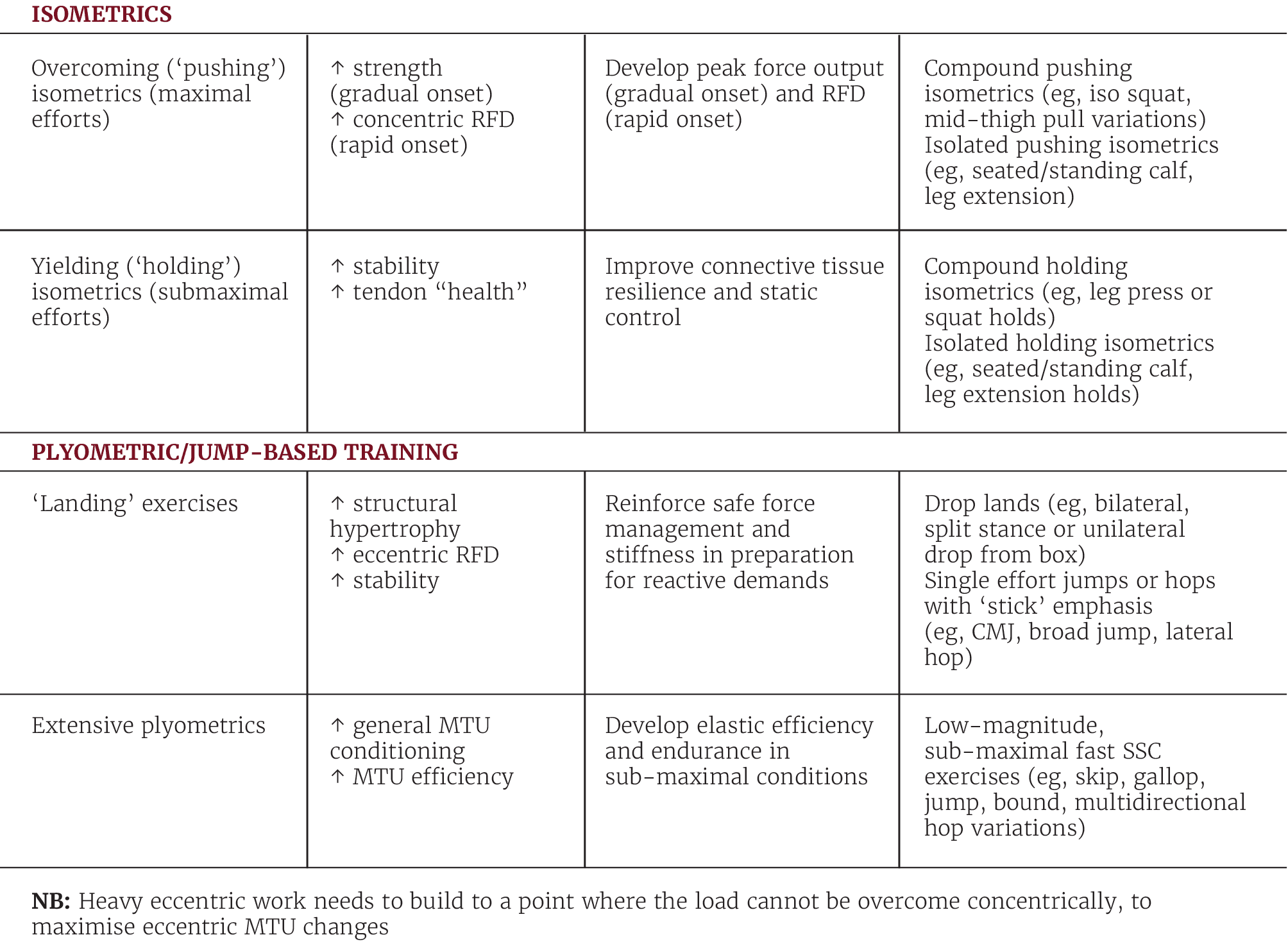 Initially, it may be prudent to emphasise some combination of heavy resistance training, slow eccentric training, isometric training, and extensive plyometrics to build the capacity of the MTU to handle load. These preparatory exercises ensure the systems are equipped to progress to faster eccentrics and landing drills, where managing ground reaction forces becomes a critical focus. Resistance training and heavy eccentrics should be performed to near failure to drive anatomical adaptations, particularly for structural and hypertrophic changes. Isometric exercises can play an important role in this process but should be tailored to the intended outcome.49,33 Yielding (or ‘holding’) isometrics are particularly effective for stability and tendon remodelling, probably due to the tendon creep induced by longer-duration holds.50,40 These exercises are ideal for enhancing connective tissue resilience and preparing the MTU for dynamic loads, but demonstrate the potential to impair stiffness if prescribed in isolation. In contrast, overcoming (or pushing) isometrics are more effective for developing stiffness, particularly when performed with a rapid onset (ie, maximal explosive intent) and short (<6 sec) durations.