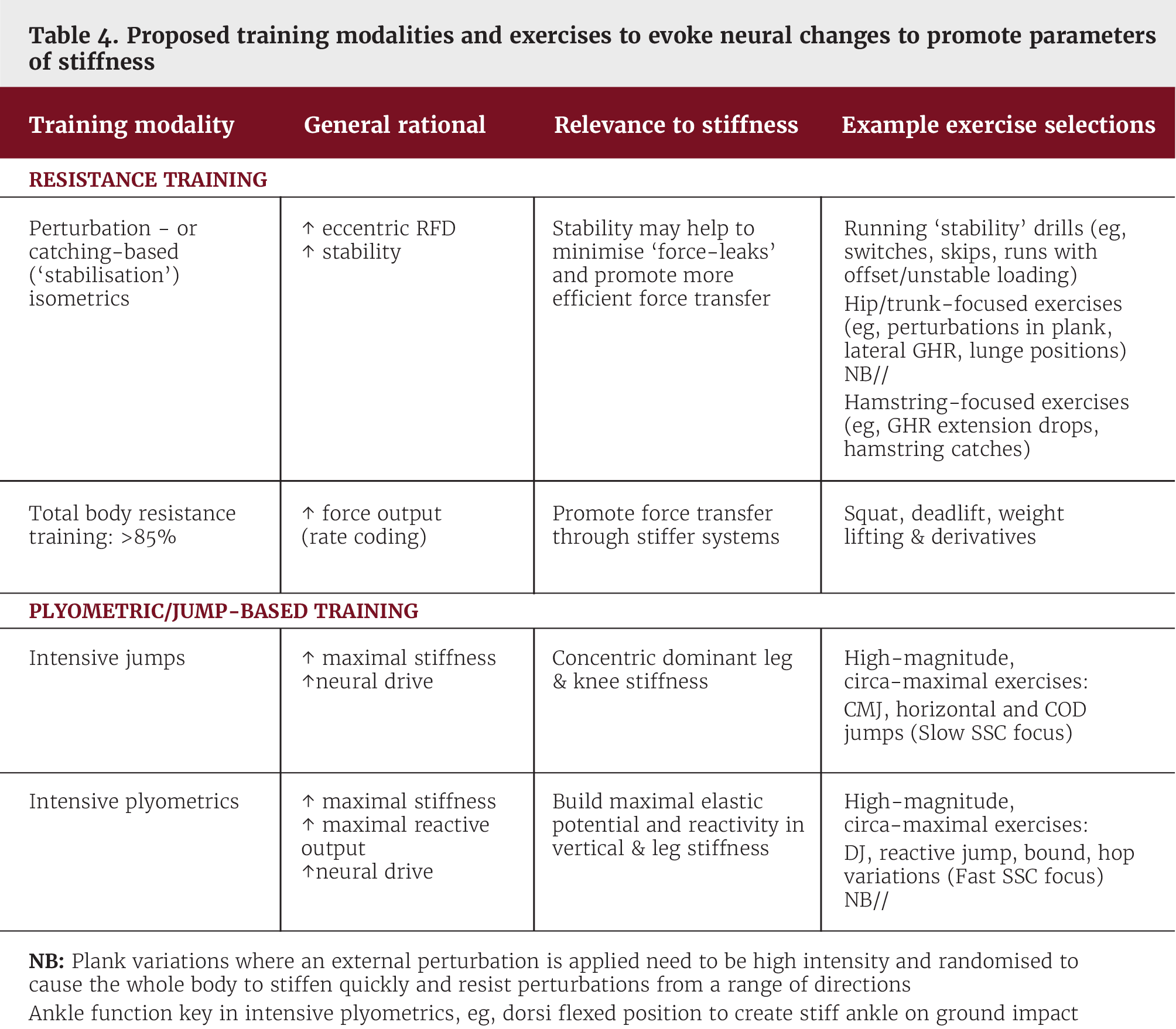 Although these training recommendations are presented in a logical order, which may appeal to a coach using them in a linear periodised plan to maximise a specific outcome, they can just as easily be included in a more conjugated plan; this would train all aspects of stiffness, with key aspects promoted based on a performer’s weaknesses or the period of the season you are working in. The presented training has a wide variety of potential interventions, which is recommended as performers have individual needs, with training variety shown to help improve performance and mitigate injury risk.17